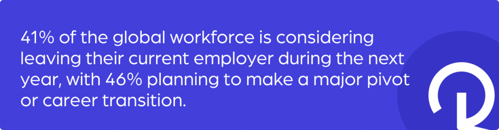 41% of the global workforce is considering leaving their current employer during the next year, with 46% planning to make a major pivot or career transition.