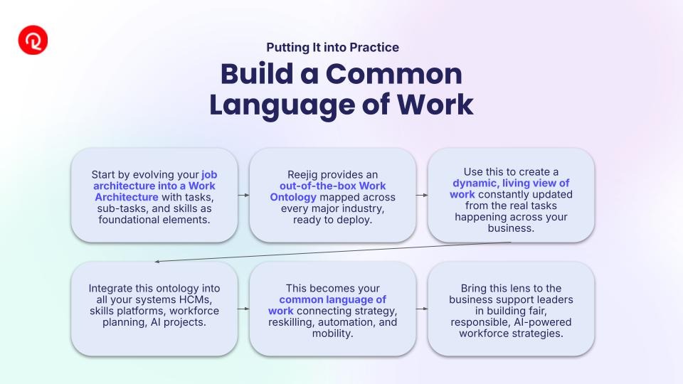 In practice, this means shifting from documenting jobs to continuously understanding and governing work as it actually happens. Reejig supports this by embedding a Work Ontology™ and Work Architecture together, enabling a dynamic, enterprise-wide view of tasks, skills, and outcomes that connects strategy, automation, reskilling, and mobility.