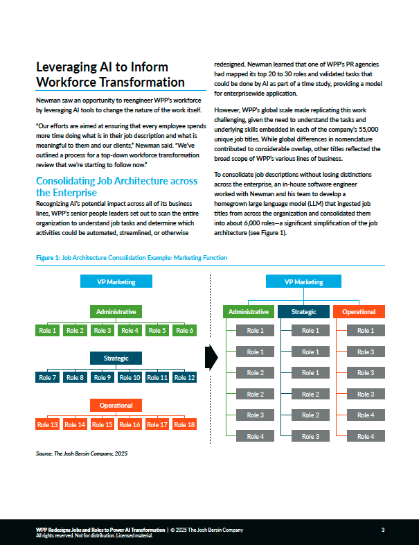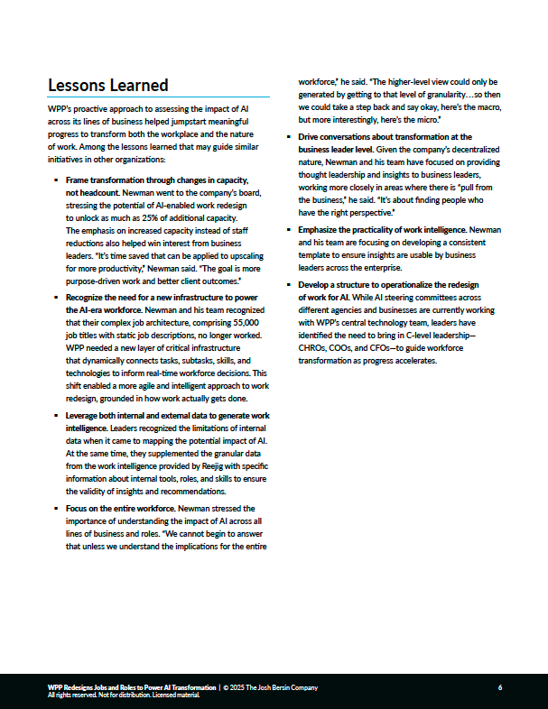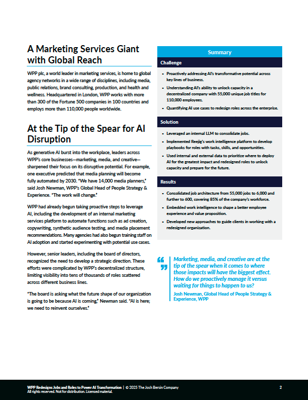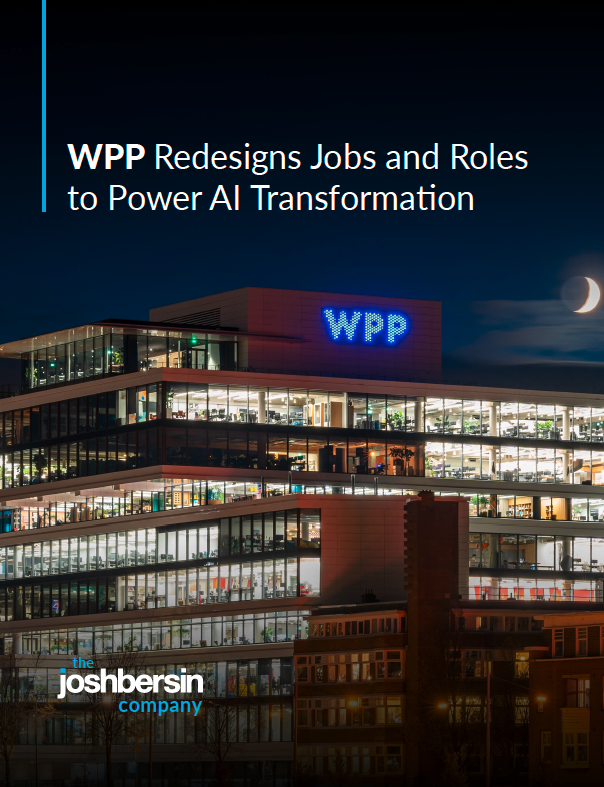 Discover how global marketing giant WPP consolidated 55,000 job titles into just 600, unlocked up to 25% capacity gains, and redesigned work at scale using AI and work intelligence. In this exclusive case study, Josh Bersin breaks down how WPP’s approach is setting a new standard for enterprise AI transformation.